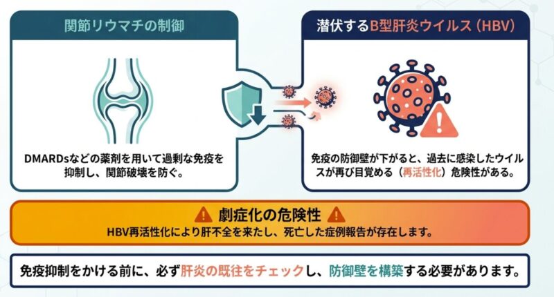 関節リウマチ(RA)の治療は、近年の生物学的製剤(bDMARDs)JAK阻害薬、メトトレキサートなどの進歩により、劇的に改善しました。しかし、強力な免疫抑制作用を持つ薬剤を使用する際、あらかじめ注意深く確認しなければならないのが「B型肝炎ウイルス(HBV)の再活性化」です。