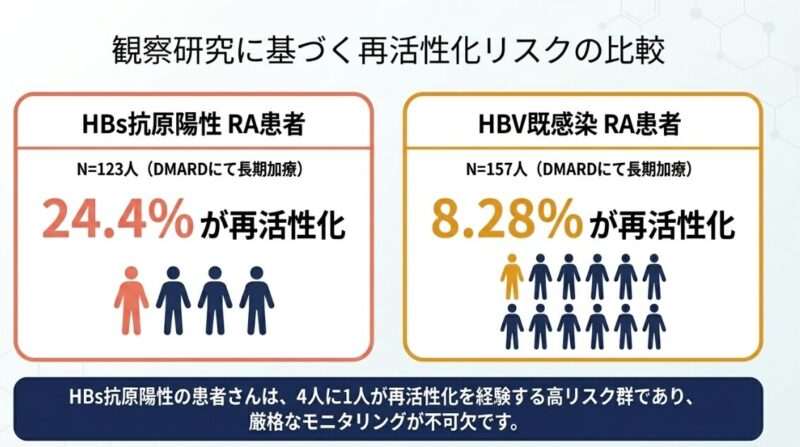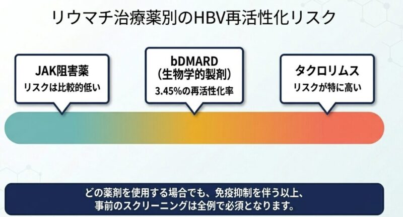 既報では、HBs抗原陽性の患者さんが特定の免疫抑制剤で治療を受けた際、約24.4%でウイルスの再活性化が認められました。薬剤別ではタクロリムスでリスクが高く、一方でJAK阻害薬や生物学的製剤は比較的リスクが低い傾向にありますが、いずれにせよ油断は禁物です。