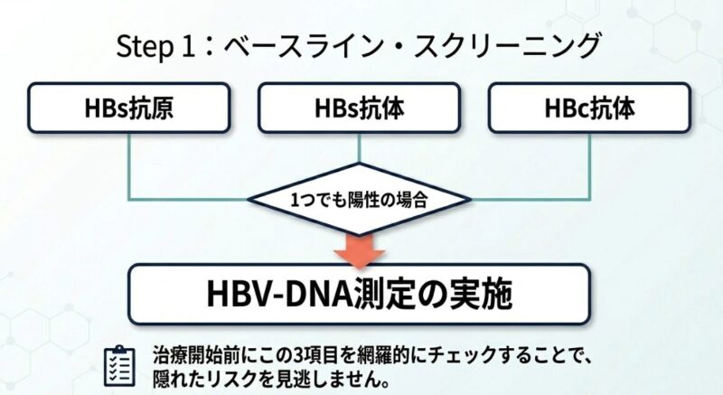 当院では治療開始前に必ず、HBs抗原、HBs抗体、HBc抗体の3項目をチェックします。これらが一つでも陽性の場合は、すでにウイルスが体内に存在している可能性があるため、血液中のウイルス量を測るHBV-DNA定量検査を行います。
