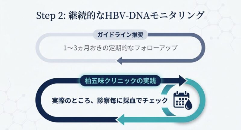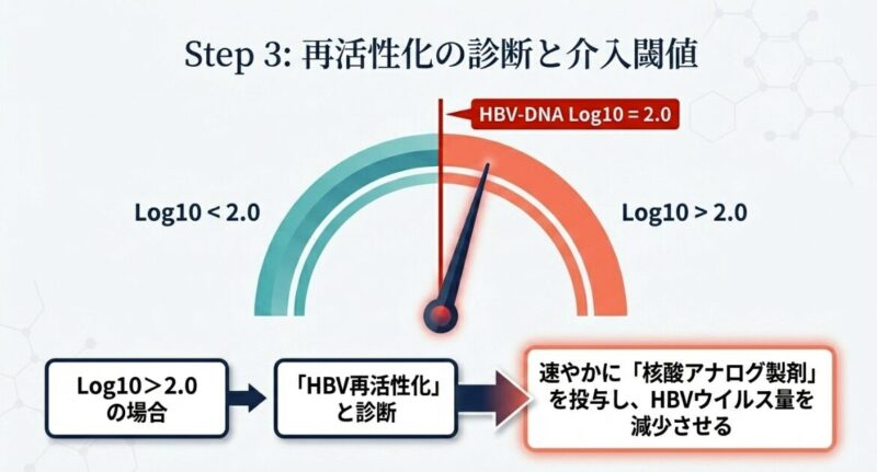 特にHBs抗原が陽性の方は再活性化のリスクが高いため、治療開始後も1〜3ヶ月おき(または受診毎)の定期的なモニタリングが不可欠です。HBV-DNAの値が一定基準(log10 > 2.0)を超えた場合には、再活性化と診断し、ウイルスを抑えるための核酸アナログ製剤による治療を速やかに開始します。