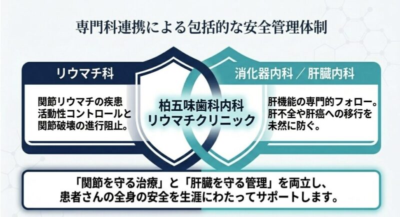 大切なのは、リウマチ専門医と消化器内科(肝臓内科)が密に連携し、関節の炎症を抑えつつ、肝臓の健康を生涯にわたって守り抜くことです。当院はリウマチ専門医も肝臓内科専門医も在籍しており密な連携を可能にしています。