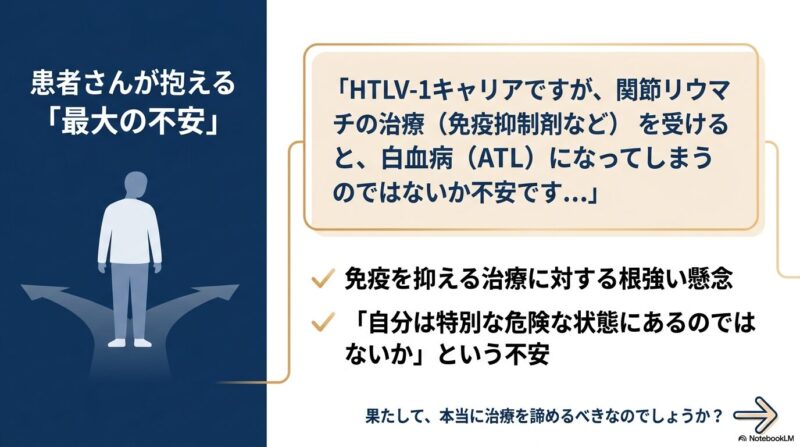 「自分はHTLV-1(ヒトT細胞白血病ウイルス1型)のキャリアだけど、強いリウマチの薬を飲んでも大丈夫?」という不安をお持ちの患者さんは少なくありません。HTLV-1陽性の場合、免疫抑制剤の使用によって成人T細胞白血病(ATL)やHTLV-1関連脊髄症(HAM)が発症・悪化するリスクが懸念されるためです。
