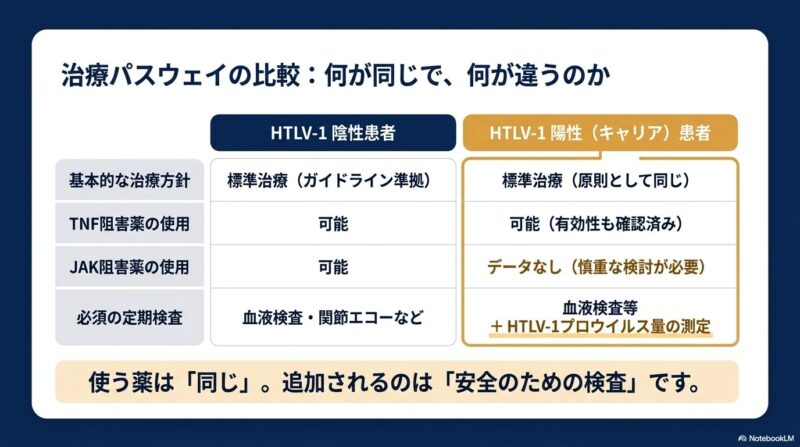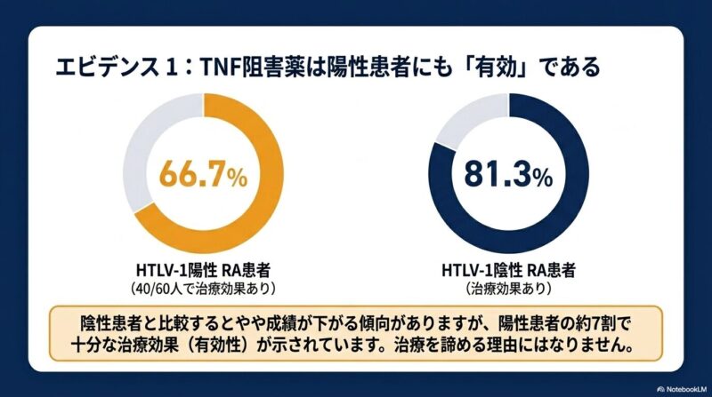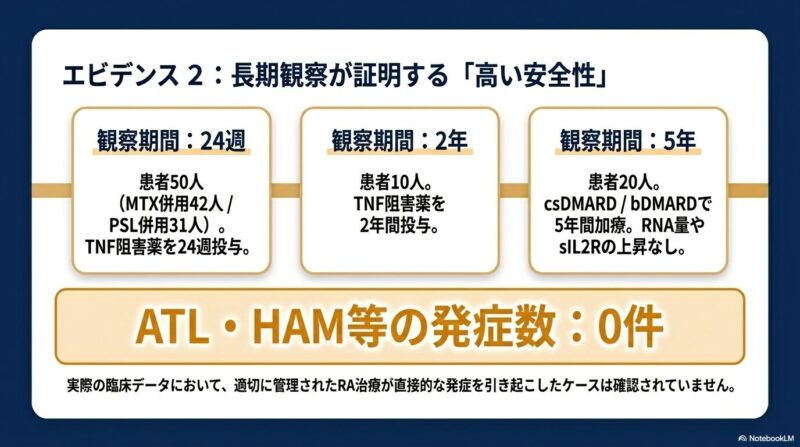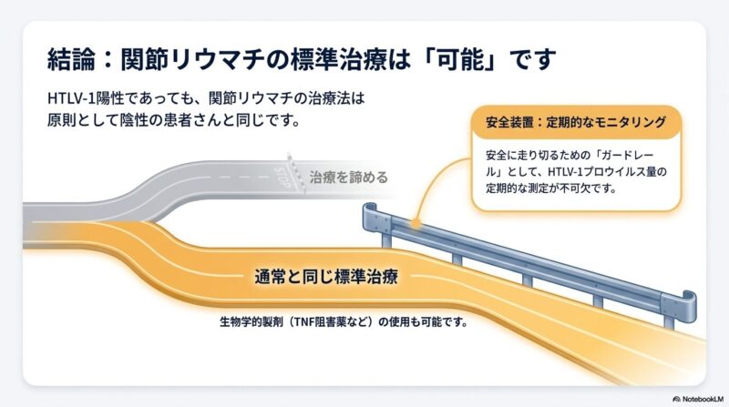 これまでの研究では、TNF阻害薬などの生物学的製剤(bDMARDs)がHTLV-1陽性の患者さんに対しても有効であることが示されています。一部の報告では陰性の患者さんと比べて効果がやや低い可能性も示唆されていますが、多くの観察研究において、治療開始後に直ちにATLやHAMを発症したという明確な証拠は見つかっていません。メトトレキサート(MTX)についても、慎重なモニタリングのもとで使用が継続されています。