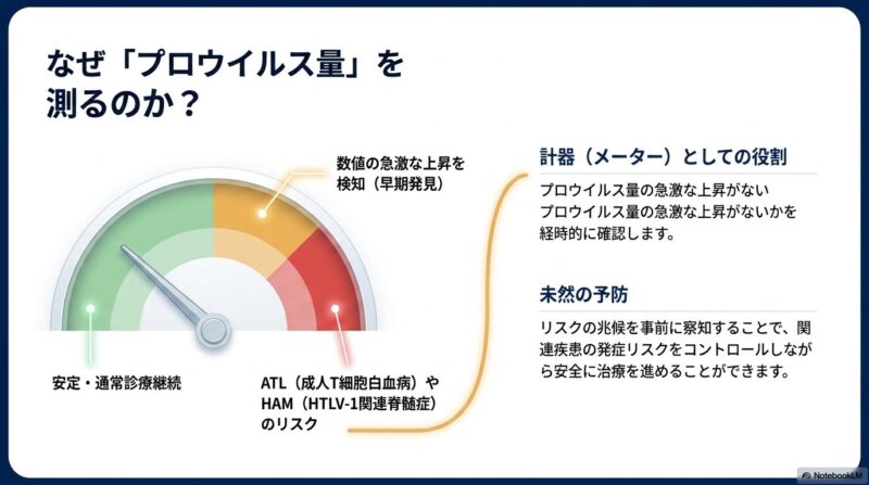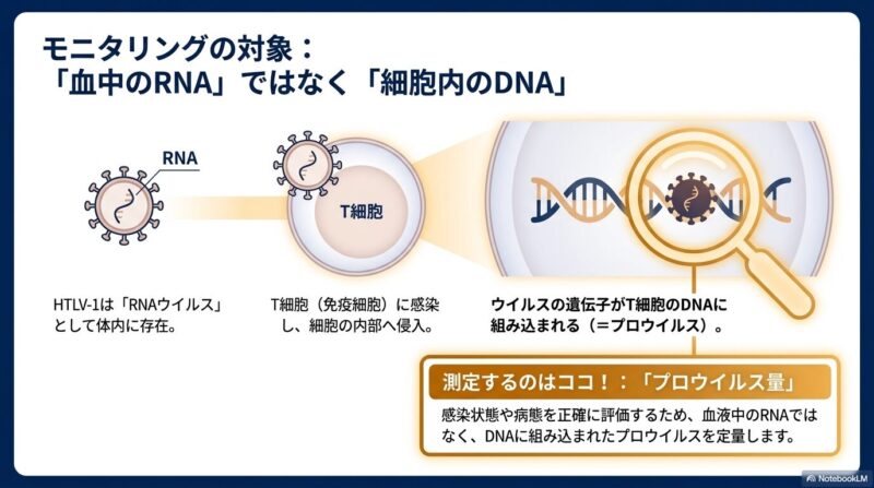 治療において最も重要なポイントは、定期的な「HTLV-1プロウイルス量」の測定です。HTLV-1はRNAウイルスですが、感染すると細胞のDNAに組み込まれる性質があるため、この「プロウイルス量」を調べることでウイルスの状態を正確に評価します。この数値に急激な上昇がないか、あるいはsIL-2Rなどの数値に異常がないかを定期的にチェックすることで、ATLなどの合併症のリスクを監視します。