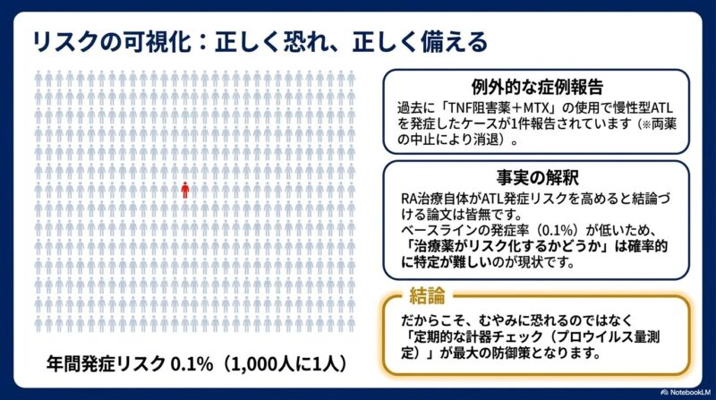 ただし、免疫抑制療法がATLの発症リスクを完全にゼロにするかどうかについては、まだ医学的に分かっていない部分もあります。そのため、日本リウマチ学会のガイドラインに基づいた専門的な管理と、細かな体調変化への注意が不可欠です。