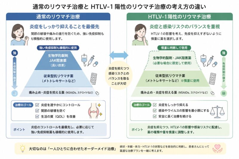 結論からお伝えすると、HTLV-1陽性でも関節リウマチの治療は可能です。ただし、通常よりも慎重な薬の選択が必要になります。