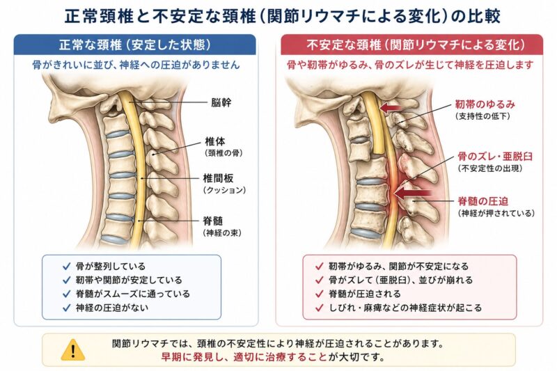 といった変化が起こります。首(頚椎)ではこれにより「骨のズレ(不安定性)」が生じます。