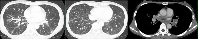 所見としては気管支壁肥厚と小葉間隔壁の肥厚あり。縦隔条件では肺門部・気管分枝部リンパ節腫脹が確認できます。