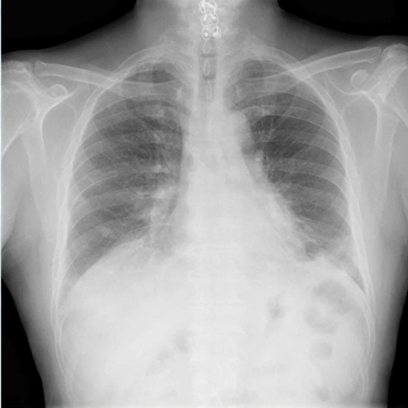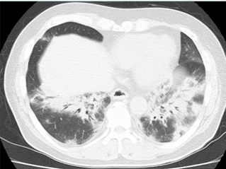 CTだとリバースドハローサインを認める胸部レントゲン写真(X-p):鑑別は結核・悪性腫瘍・膠原病や薬剤になります