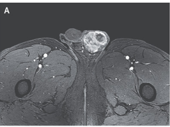 MRIでは不均一な協調を伴う分葉状の左精巣塊を認めた。