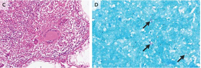 組織病理学的検査では陥落性壊死を伴う肉芽腫性炎症が認められ(C)、抗酸菌が示された(D)。