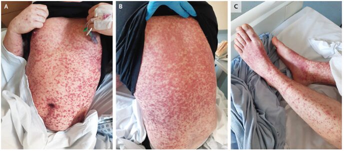 来院2日間前から発熱、掻痒の無い発疹、足首と膝の痛みを訴え、救急外来を受診した。