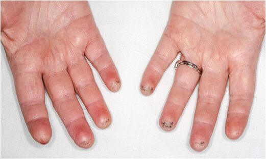 基礎ボーラスインスリン療法を受けており、指刺し検査用のランセットと音声血糖計を使って1日4~7回血糖チェックを行ってきた。その結果、指先に痛みやあざが生じ、最終的には瘢痕かや色素沈着過剰を伴う胼胝(タコ)が形成された。