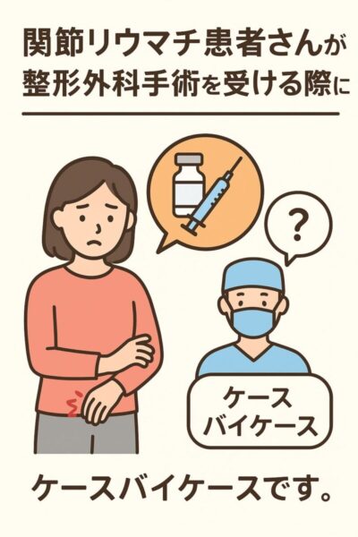 関節リウマチ患者さんが整形外科手術を受ける際に生物製剤を中止するかはケースバイケースです。