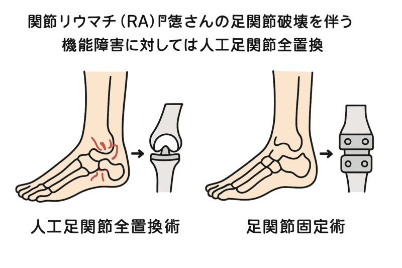 関節リウマチ(RA)患者さんの足関節破壊を伴う機能障害に対しては人工足関節全置換術、足関節固定術を考慮します