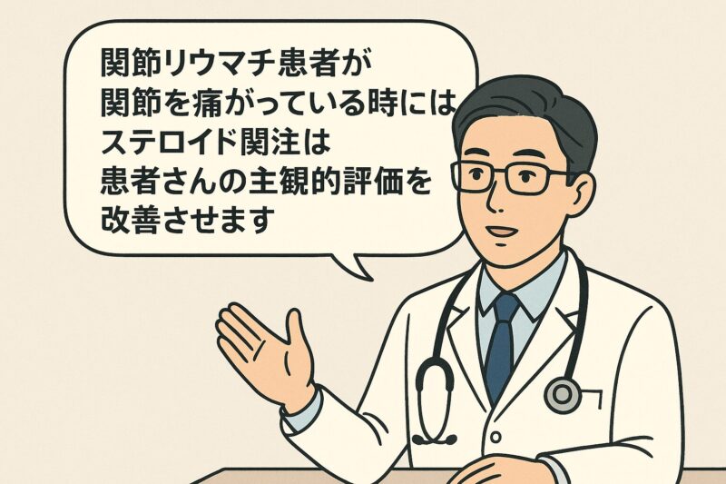 関節リウマチ患者に対するステロイド局所注射(関節内注射)は、患者主観的評価(痛みやこわばりなど)を改善させる効果があります。