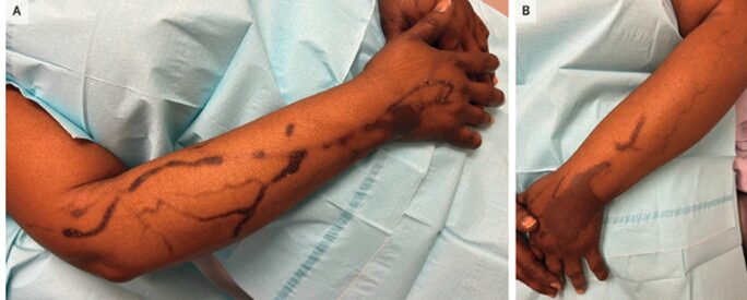 黒ずんだ皮膚は表在静脈のネットワークに沿って直線的なパターンで腕まで伸びていた。