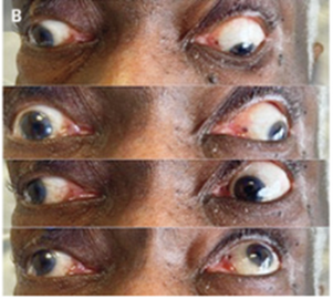 受診時身体所見としては、右眼には眼瞼下垂、無反応瞳孔、挙上、下降、内転障害を認めた。