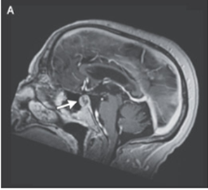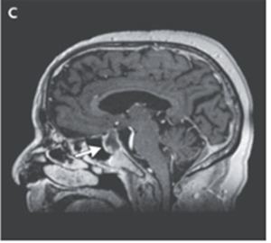 頭部MRIではT1強調像にて出血を伴う下垂体病変の拡大が明らかになった。