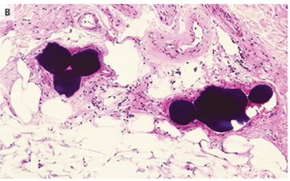 皮膚生検により、HE染色表皮壊死、ケラチノサイトおよびエクリン腺の反応性異型、ならびに緻密な好塩基性物質で構成される円形塞栓による真皮網状小血管の閉塞が明らかになった。
