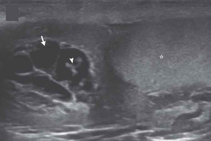 陰嚢超音波では右精巣(星印)および精巣上体の近くに索状構造物を認め、移動性があることが確認された。カラードップラーは陰性だった。
