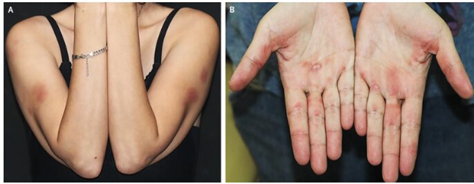 上腕には紅斑が確認され(A)、手の腹側表面には紅斑ならびに丘疹や膿疱が確認された(B)。