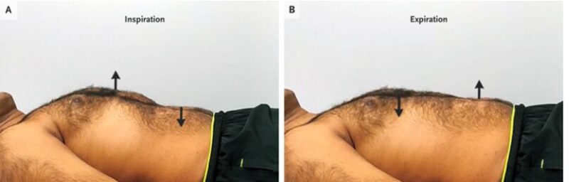 胸壁の副筋肉が収縮して胸の圧が下がると弱くなった横隔膜が上向きに動き、腹壁が内側に動く(腹部がへこむ)という動きなる。