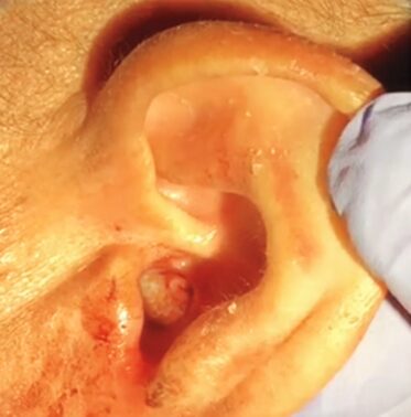 5日前から左耳の痛み、かゆみ、出血を訴えて救急外来受診。