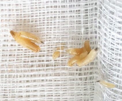 幼虫を除去するために、耳吸引器、鉗子、滅菌水を用いて幼虫の除去が施行された。出てきた虫が下記。