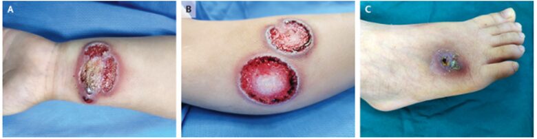 入院時左前腕(A)と右ふくらはぎ(B)に潰瘍を認め、右足背にも紫色硬化性病変を認めた(C)。