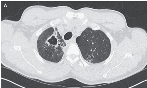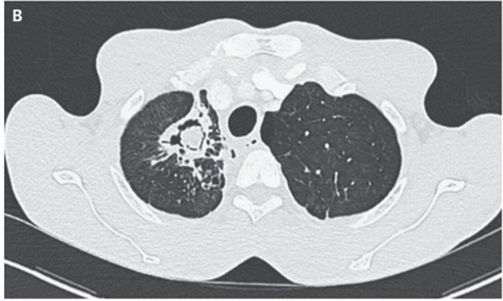 来院16か月前の胸部CTでは治療した肺結核の後遺症である右上葉の空洞が示されていた。
