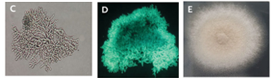 顕微鏡では、鋭角に分岐した菌糸が観察された(C:染色なし、D:蛍光染色)