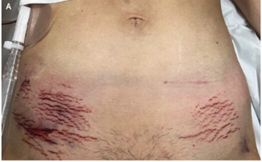 下腹部には斑状出血の水平パターンが明らかになった(A)。これは「シートベルトサイン」として知られている。
