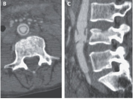 造影CT検査では、L4前方の腹部大動脈の全周性内膜破壊を認めたこと(B)とL4椎骨骨折(C)があきらかになった。造影剤の大動脈血管外漏出や大動脈解離、血栓症は認めなかった。