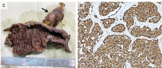 病理組織学検査により、リンパ節内の高分化神経内分泌が示され、免疫組織化学染色でガストリン陽性だった(D)。