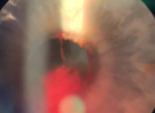 この血液は上瞳孔縁にある「虹彩微小血管腫」より出血していることが確認された。