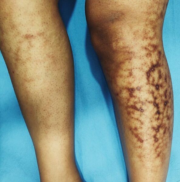 身体所見としては左脚において網状の色素沈着と萎縮性瘢痕を多数認めた。右脚にも認めたが、左>右だった。
