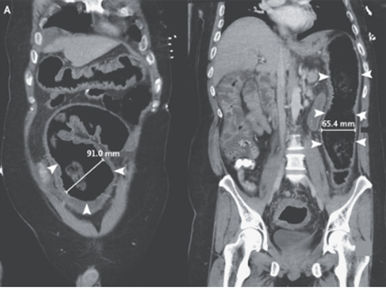 腹部CTではS状結腸および下降結腸の膨張を伴う汎結腸炎が明らかとなった。