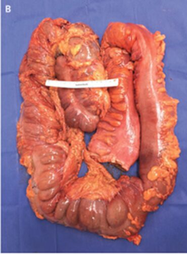 肉眼的な病理検査により、偽膜を伴う結腸の拡張が示された。