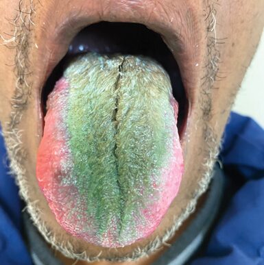 受診時の身体所見では、舌には細長い糸状乳頭があり、緑色に変色していた。