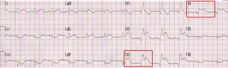 V2とV3はSTは低下していないといけないが、本来ST低下しなくてはならないところで上向きになっている→明らかにおかしい心電図。