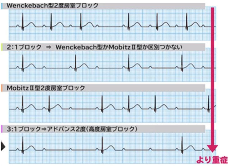 3:1や4:1の房室ブロックはアドバンス(高度)房室ブロックⅡ度と診断し循環器内科コンサルト。(MobitⅡ型より重症度が高い)