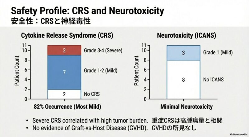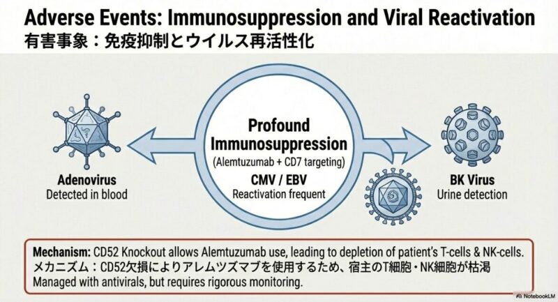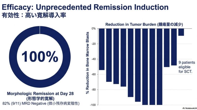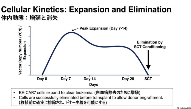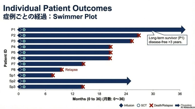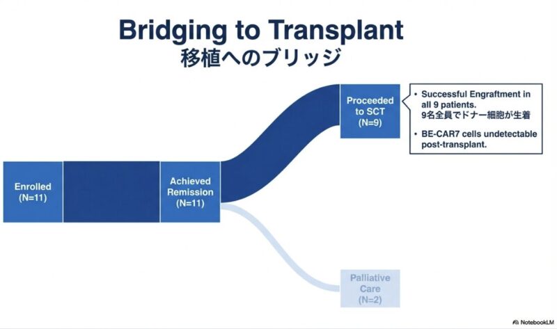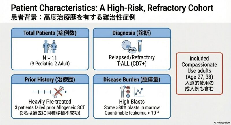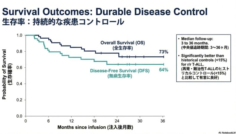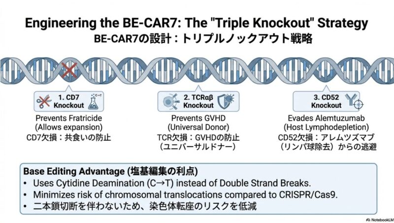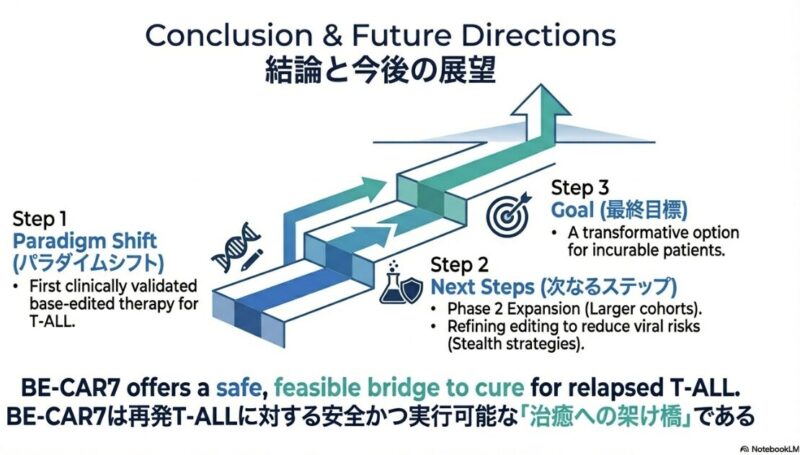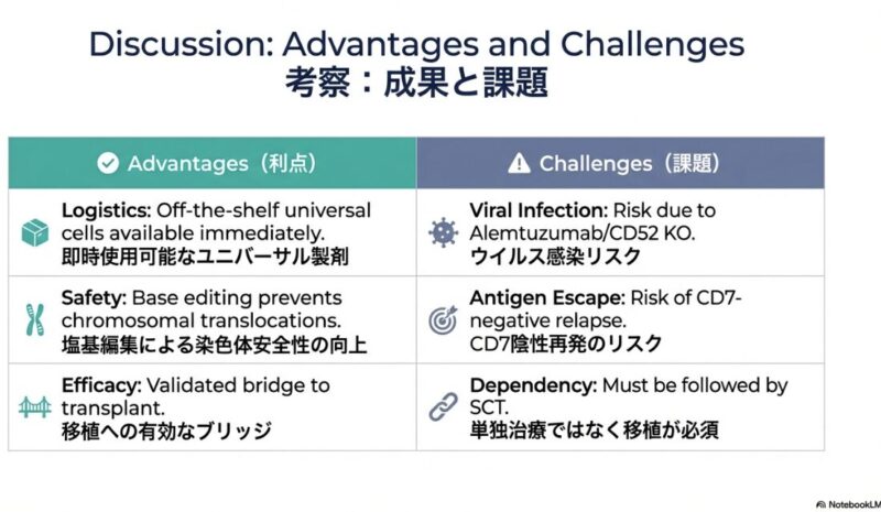 この研究論文は、従来の治療法が効かない再発・難治性のT細胞急性リンパ性白血病(T-ALL)に対し、最新の塩基編集技術(ベースエディティング)を用いた革新的な治療法を提示しています。健康なドナーの細胞を加工したユニバーサルBE-CAR7 T細胞を患者に投与したところ、標的となる癌細胞を効果的に攻撃し、調査対象となったほぼすべての患者で完全な形態学的寛解を誘導することに成功しています。この治療は、最終的な治癒を目指すための同種造血幹細胞移植への橋渡しとして極めて有効であり、高リスクの患者でも移植へと進む道が開かれた点が重要です。一方で、強力な免疫抑制に伴うウイルス感染症の合併症や、一部で見られたCD7抗原の消失による再発といった課題も浮き彫りになっており、今後のさらなる技術改善と長期的な安全性の検証が期待されています。